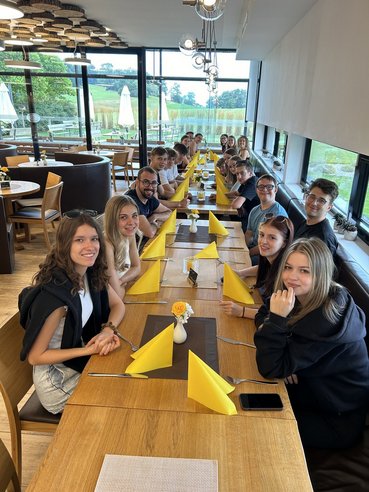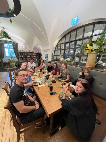Anschließend ging es nach Vyšší Brod, wo das eigentliche Highlight des Tages wartete: Rafting auf der Moldau. In Gruppen von vier bis sechs Personen stiegen die Teilnehmer in Schlauchboote und paddelten gemeinsam flussabwärts. Die Tour sorgte für viel Spaß und Teamarbeit, allerdings wurde unterwegs an den Bars entlang der Strecke etwas zu ausgiebig verweilt. Dadurch geriet der Zeitplan ins Wanken, und die Gruppe kam mit einer Stunde Verspätung zur geplanten Einkehr in der Freistädter Brauerei an.