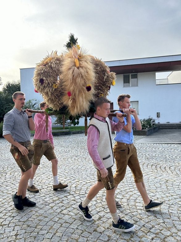 Mit der Erntezeit begannen auch wieder die Vorbereitung für die diesjährige Erntekrone für unsere Pfarre. Bereits im Juni wurden die verschiedenen Getreidesorten wie Roggen, Weizen, Hafer oder Gerste von den Feldern abgeschnitten und zum Trocknen aufgehängt. Zwei Wochen vor dem Erntedankfest begannen wir, die einzelnen Stränge der Krone neu zu binden und zu dekorieren. Am Tag des Erntedankfestes wird die Erntekrone immer noch mit frischen Blumen, Obst und Gemüse fertig geschmückt und von vier motivierten Trägern beim Umzug präsentiert. Der Umzug und die Messe wurden mit einem gemütlichen Frühschoppen am Pfarrplatz abgerundet.