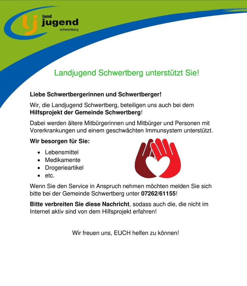 In Zeiten von Covid 19 ist es wichtig als Gesellschaft zusammen zu halten. So beteiligt sich auch die Landjugend beim Hilfsprojekt der Gemeinde Schwertberg. Wir gehen wir für Risikogruppen Einkaufen, helfen bei Essen auf Rädern und versuchen das Beste aus der Situation zu machen. Somit Leisten auch wir einen kleinen Beitrag für unsere Gesellschaft in Zeiten wie diesen.